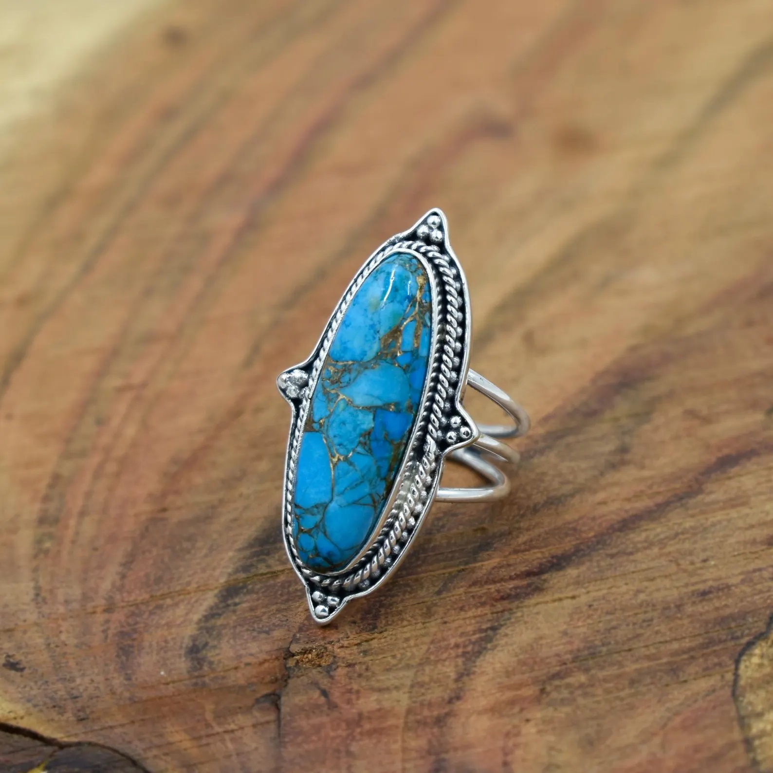 Add a bold pop of color and bohemian charm to your jewelry collection with this stunning Blue Copper Turquoise Ring, handcrafted with love and care. Featuring a long oval-shaped genuine Blue Copper Turquoise stone, this statement piece is set in high-quality 925 sterling silver—perfect for women who love unique, artisan-crafted jewelry.