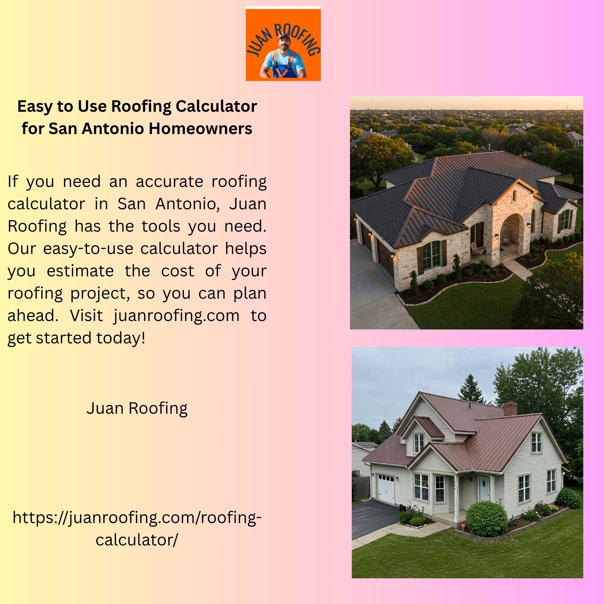 If you need an accurate Roofing Calculator In San Antonio, Juan Roofing has the tools you need. Our easy-to-use calculator helps you estimate the cost of your roofing project, so you can plan ahead. Visit juanroofing.com to get started today!