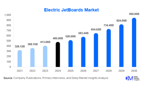 According to Deep Market Insights, the global Electric JetBoards Market size is projected to grow from USD 520 Billion in 2025 to reach USD 950 Billion by 2030, expanding at a CAGR of 12.2% during the forecast period (2025–2030).