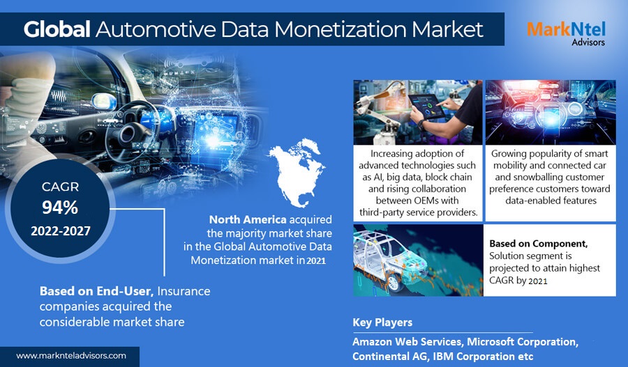 MarkNtel Advisors analyses the growth rate of the Automotive Data Monetization market in the forecast period from 2022 to 2027. In addition to comprehensive market insights such as market value, growth rate, market segmentation, key market players, and market dynamic. This detailed analysis aims to provide valuable information for stakeholders in the Automotive Data Monetization market, helping them make informed decisions.