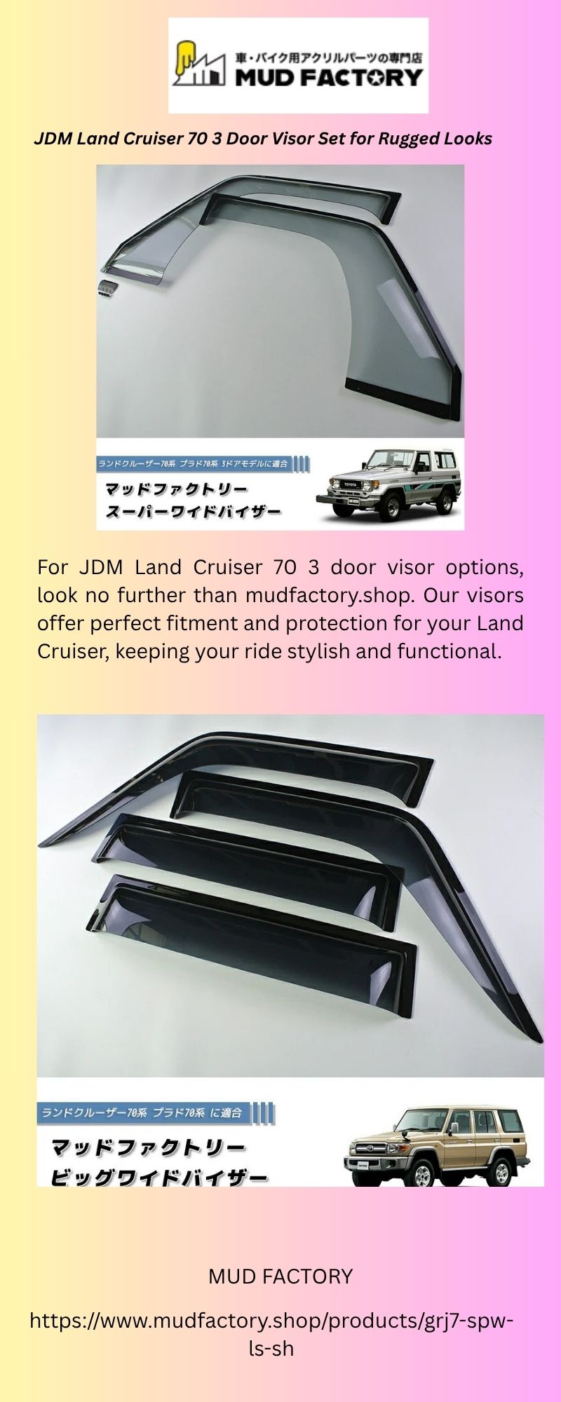 For JDM Land Cruiser 70 3 door visor options, look no further than mudfactory.shop. Our visors offer perfect fitment and protection for your Land Cruiser, keeping your ride stylish and functional.