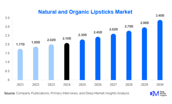 According to Deep Market Insights, the global Natural and Organic Lipsticks Market size is projected to grow from USD 2.3 Billion in 2025 to reach USD 3.4 Billion by 2030, expanding at a CAGR of 6.7% during the forecast period (2025–2030).