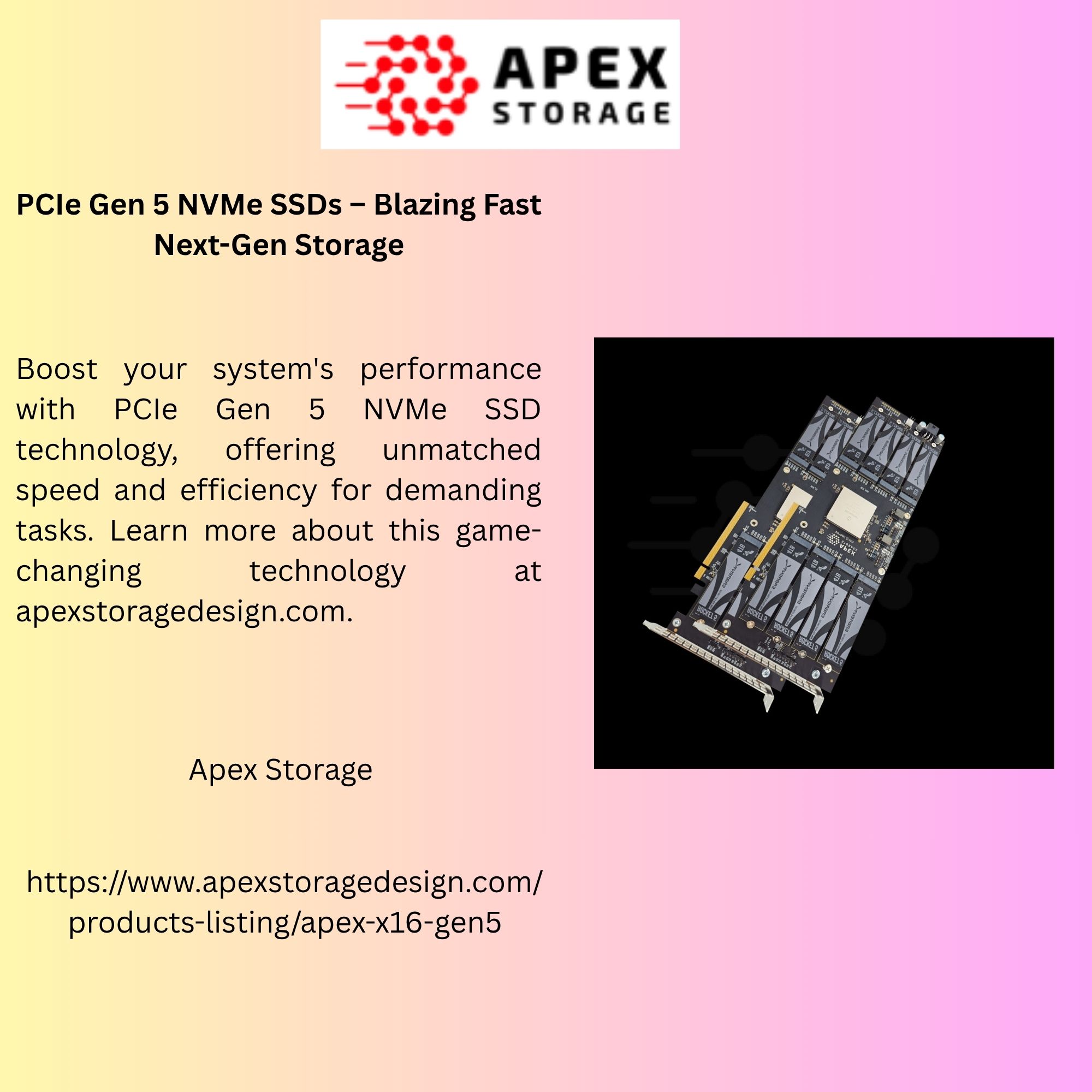 Boost your system’s performance with PCIe Gen 5 NVMe SSD technology, offering unmatched speed and efficiency for demanding tasks. Learn more about this game-changing technology at apexstoragedesign.com.