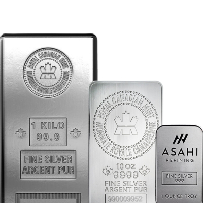 Silver Bars – usually available in sizes like 1 oz, 10 oz, or 1 kg