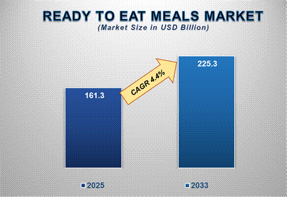 The global Ready-to-Eat (RTE) Meals Market is witnessing robust growth, driven by shifting consumer lifestyles, urbanization, and rising demand for convenient, time-saving food solutions. Valued at USD 161.3 billion in 2025, the market is projected to reach USD 225.3 billion by 2033, growing at a CAGR of 4.4% during the forecast period.