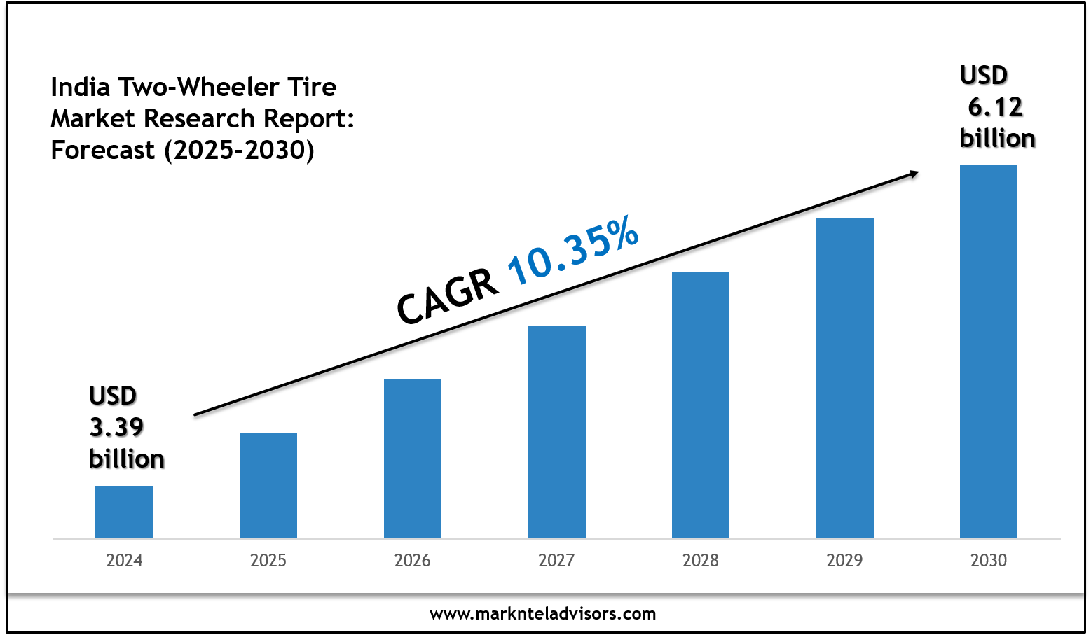 The India Two-Wheeler Tire Market size was valued at around USD 3.39 billion and is projected to reach USD 6.12 billion by 2030. Along with this, the market is estimated to grow at a CAGR of around 10.35% during the forecast period, i.e., 2025-30.
