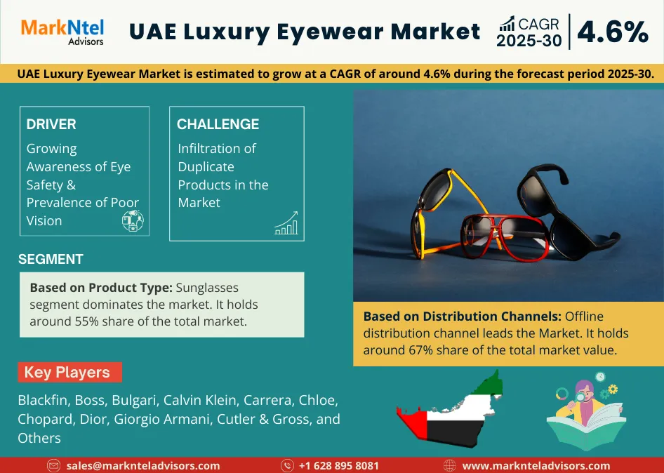 MarkNtel Advisors analyses the growth rate of the UAE Luxury Eyewear market in the forecast period from 2025 to 2030. In addition to comprehensive market insights such as market value, growth rate, market segmentation, key market players, and market dynamic. This detailed analysis aims to provide valuable information for stakeholders in the UAE Luxury Eyewear market, helping them make informed decisions.