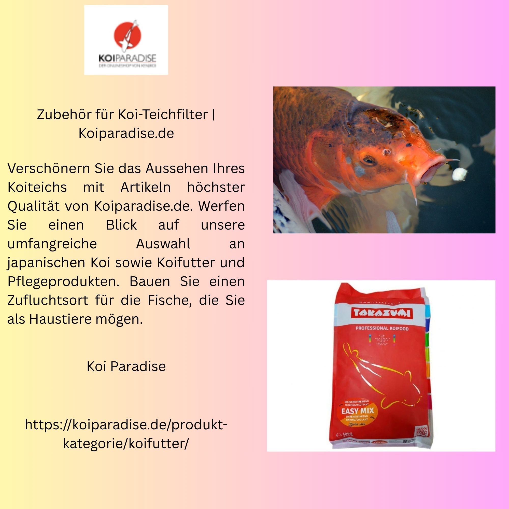 Verschönern Sie das Aussehen Ihres Koiteichs mit Artikeln höchster Qualität von Koiparadise.de. Werfen Sie einen Blick auf unsere umfangreiche Auswahl an japanischen Koi sowie Koifutter und Pflegeprodukten. Bauen Sie einen Zufluchtsort für die Fische, die Sie als Haustiere mögen.